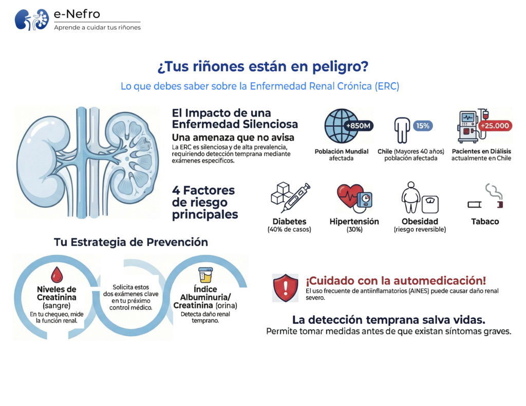 Los tres grandes factores de riesgo responsables de la mayoría de los casos de ERC son condiciones muy frecuentes en la población chilena. Si tienes alguna de ellas, tu función renal debe monitorearse con regularidad.